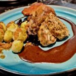 mit Braunem Zucker bestreuen. Mit Apfelsaft angiessen und im Backofen