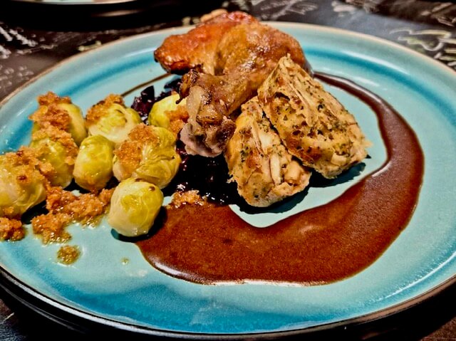 Backofen, bei 160°C, ca. 40 Minuten braten und zum Schluss